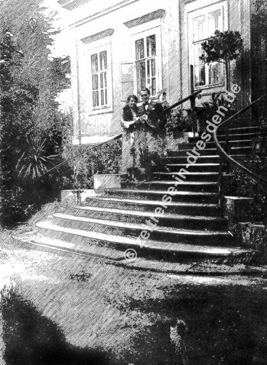 Sherwood in Dresden auf der Freitreppe vor der Villa stehend.